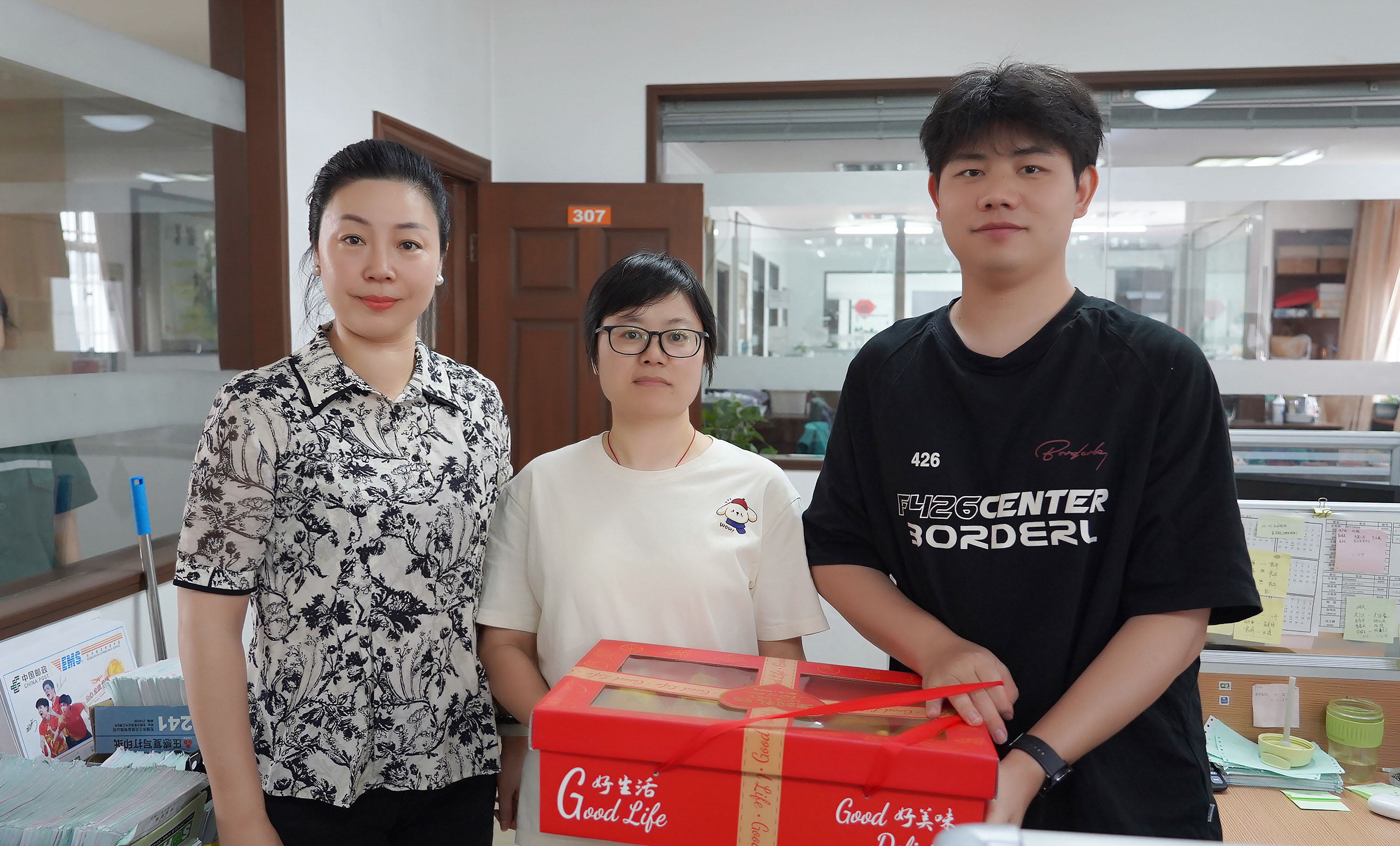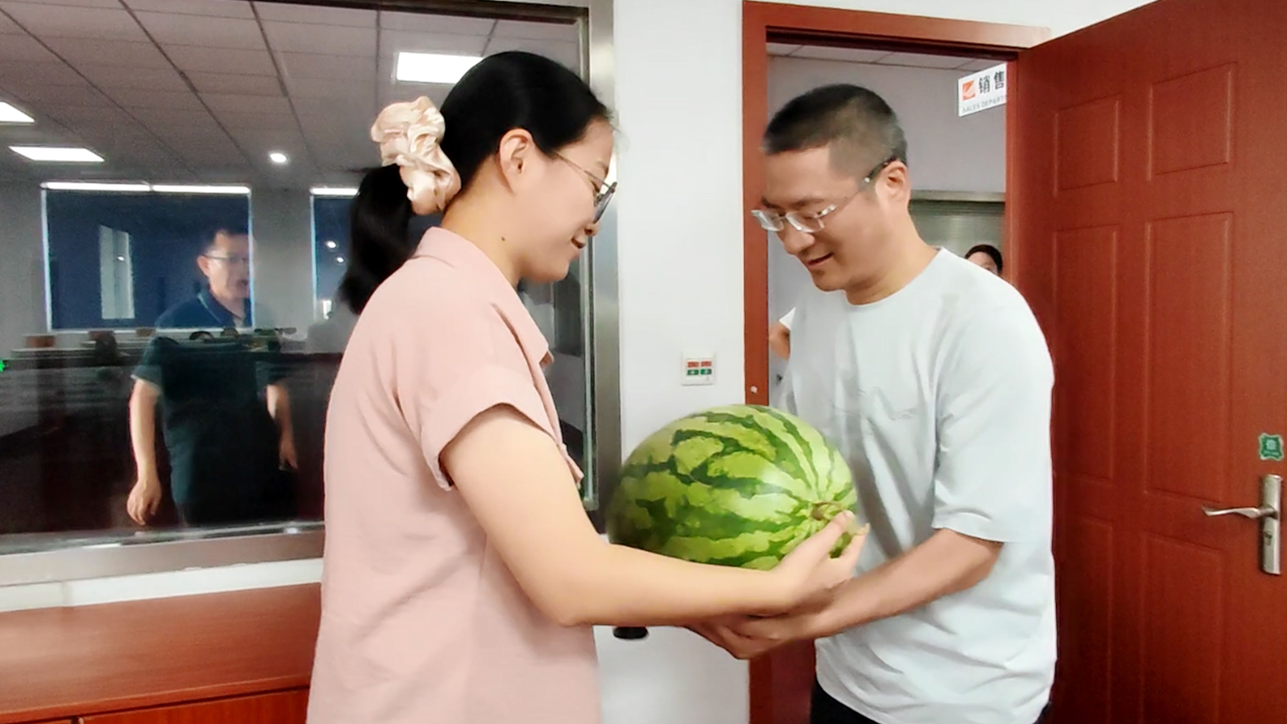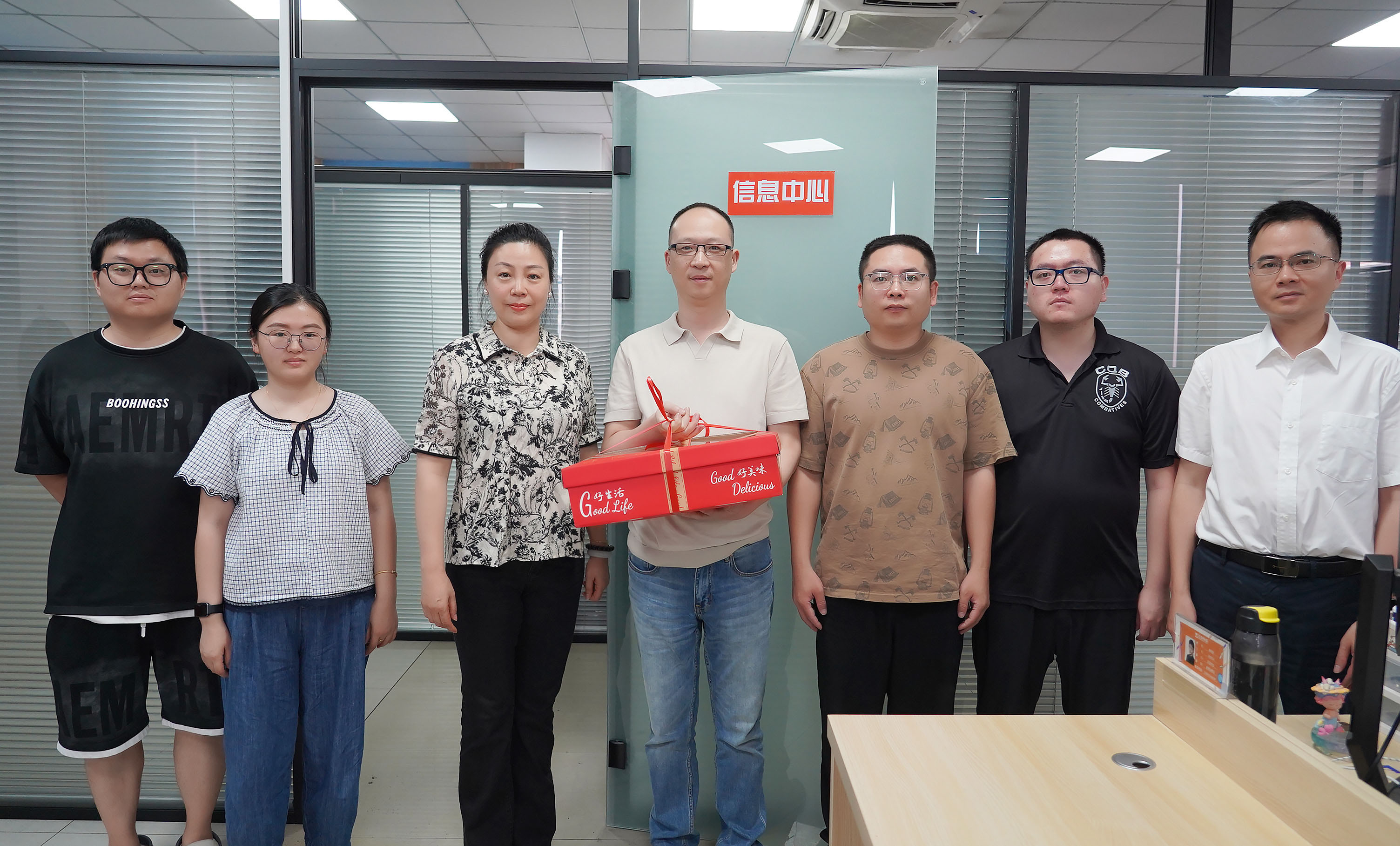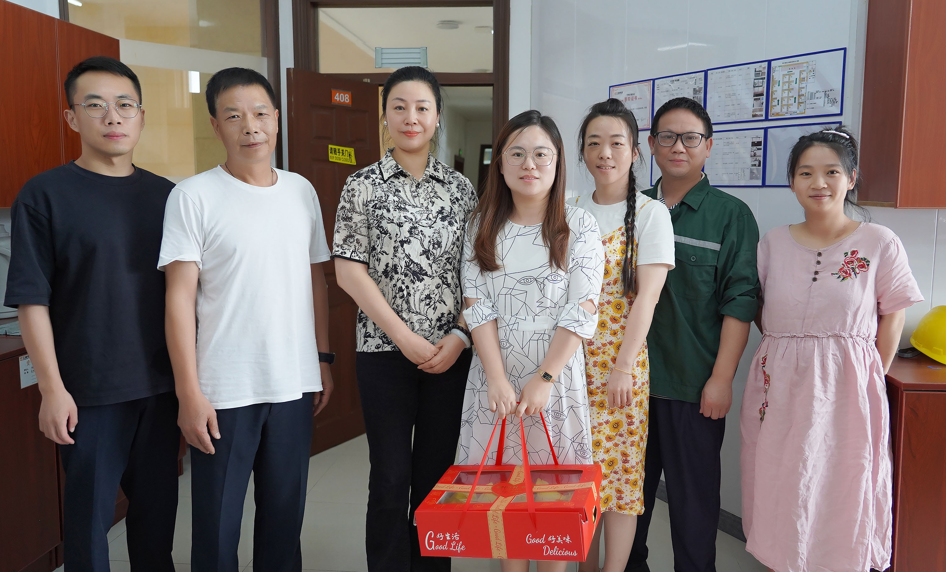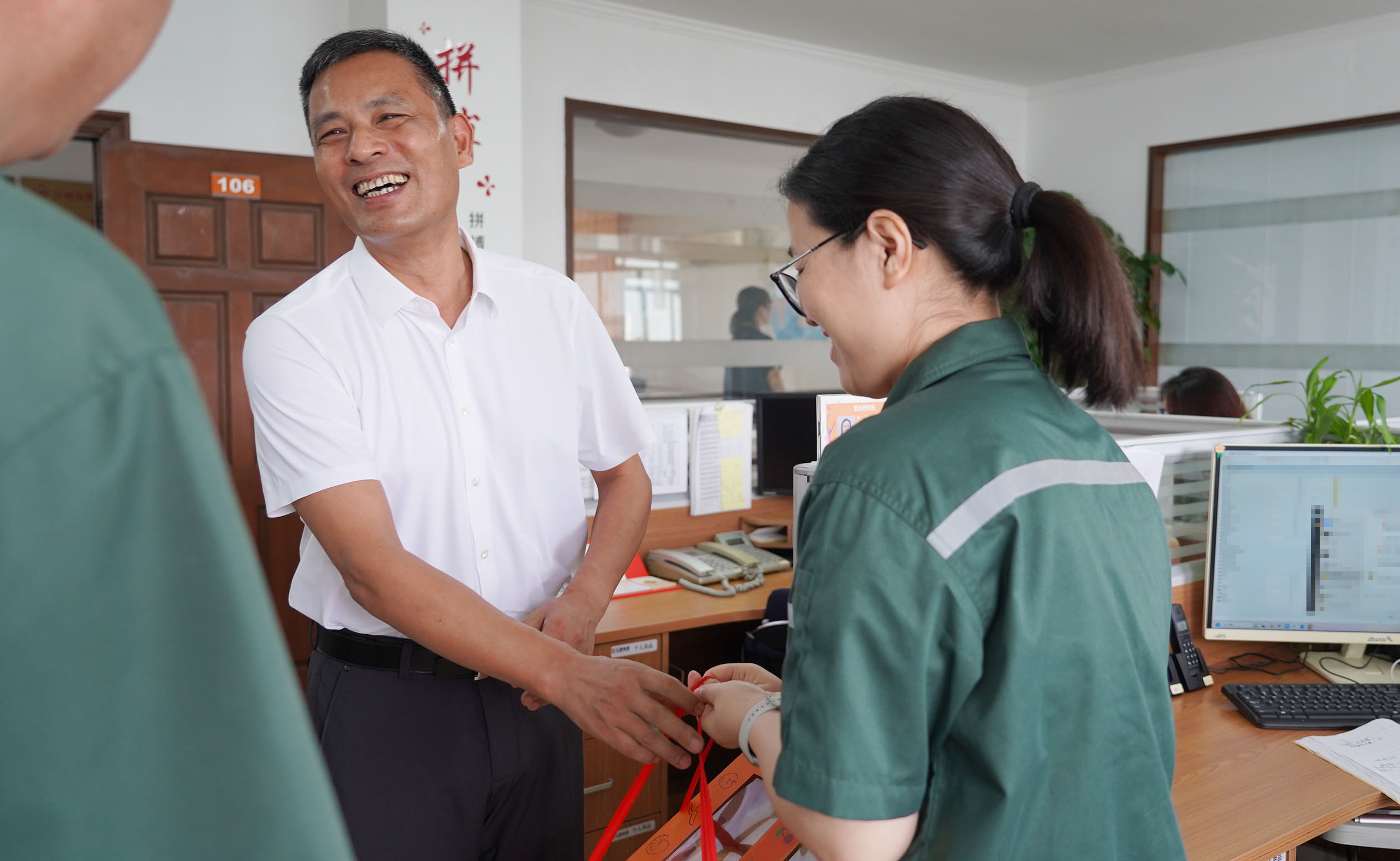 運營總經(jīng)理蔣君西、副總經(jīng)理芮一云、總經(jīng)理助理胡亞紅赴辦公樓送清涼