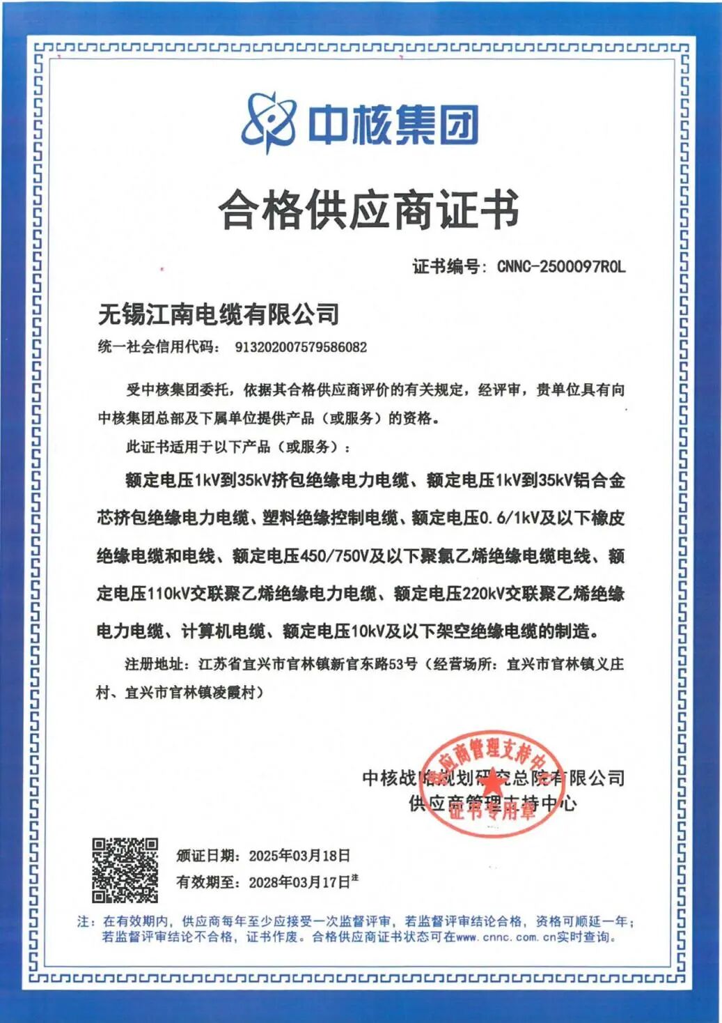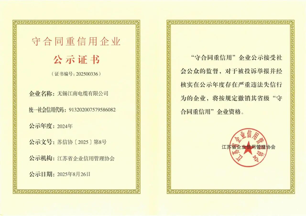 近日,江蘇省企業(yè)信用管理協會發(fā)布2024年度省級“守合同重信用”公示企業(yè)名單,江南電纜再次獲評“省級守合同重信用”企業(yè)。